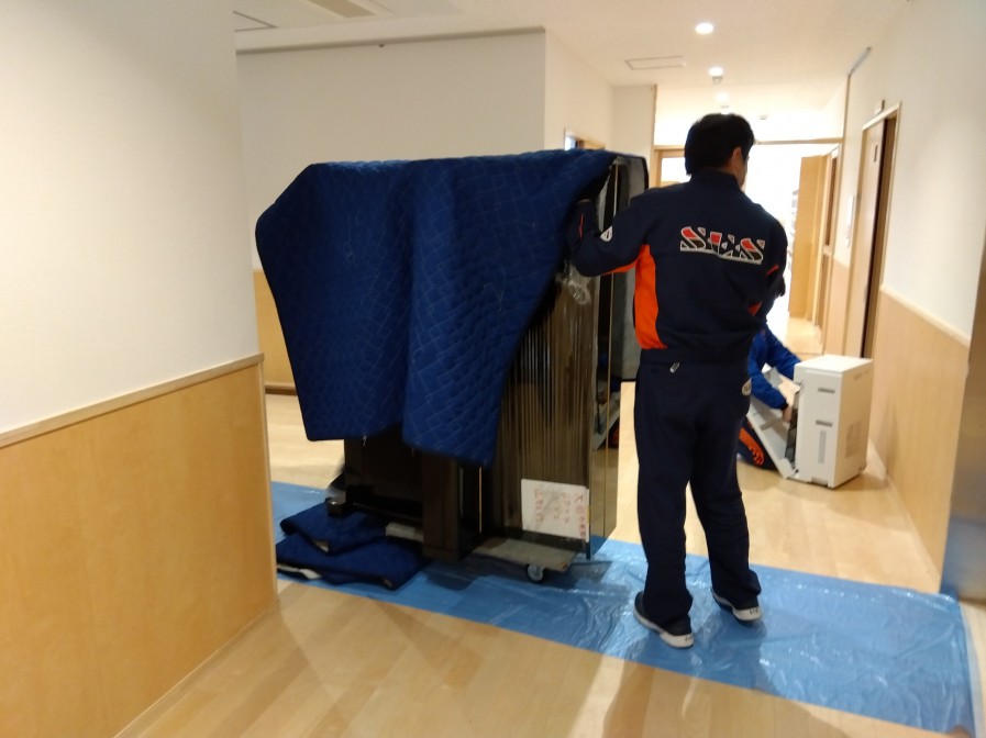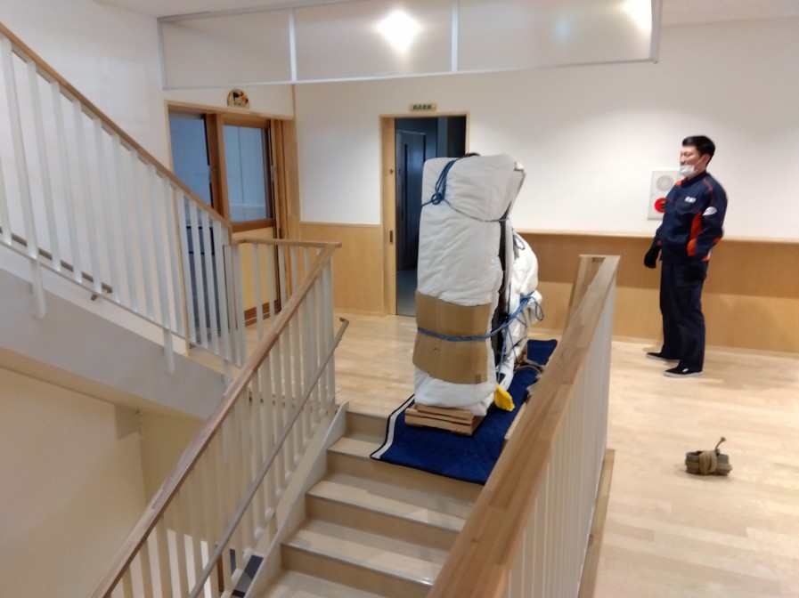 アップライトピアノは立てて、エレベーターにて搬入♪