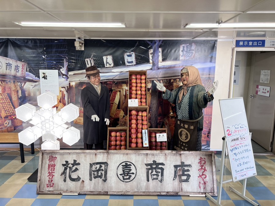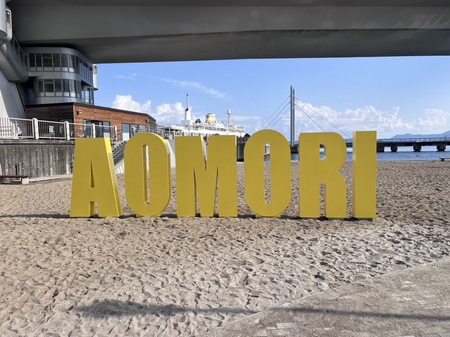 砂浜にはAOMORIの看板八甲田丸の船の中にはなにやら怪しげな人形が…(笑)