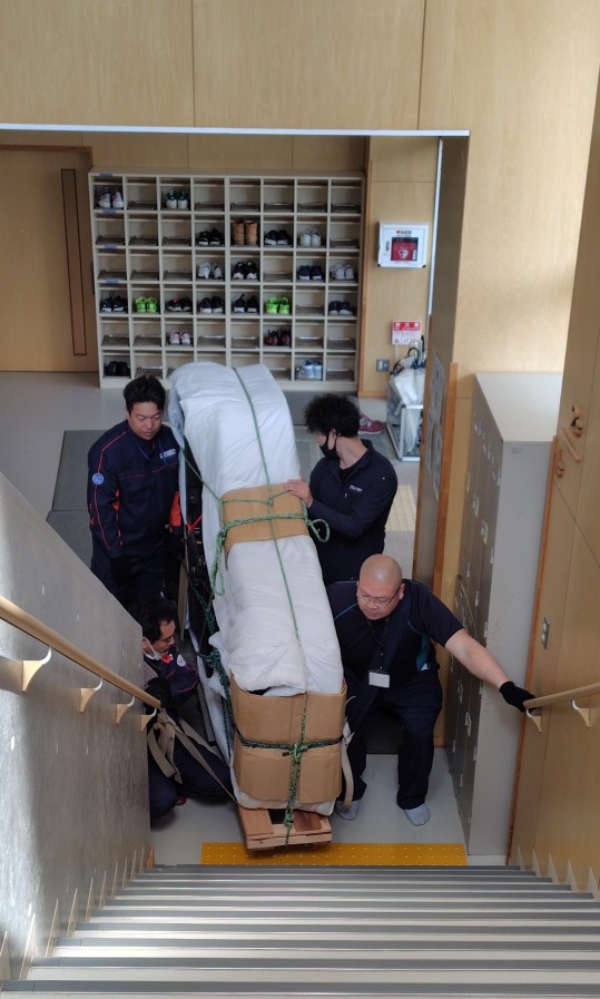 グランドピアノの階段作業アップライトピアノも階段作業。