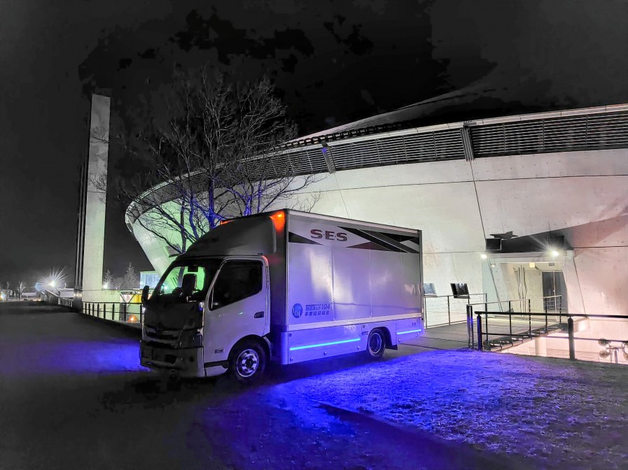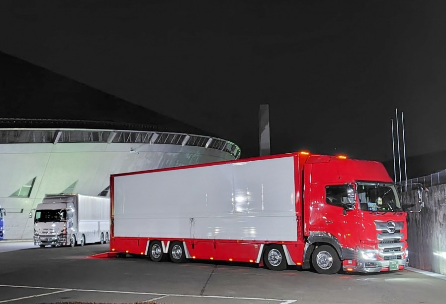 セキスイハイムスーパーアリーナからツアーで使用した照明機材搬出。早目にバラシが終わり積込み後、車庫に戻りました。
