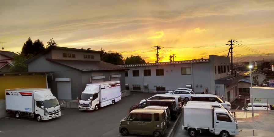 夕方遅めの出勤。2階の事務所からの夕焼けが綺麗でしたのてパチリ。