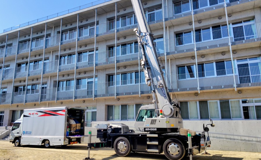 2階から階段作業で降ろしラフターにて4階へ吊り上げ作業を無事に完了致しました。