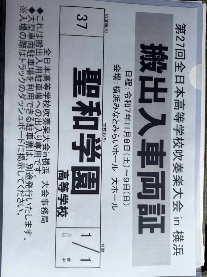11/8〜9で横浜みなとみらいホールにて全日本高等学校吹奏楽大会に出場されます、聖和学園様の楽器を運搬しておりますm(_ _)m