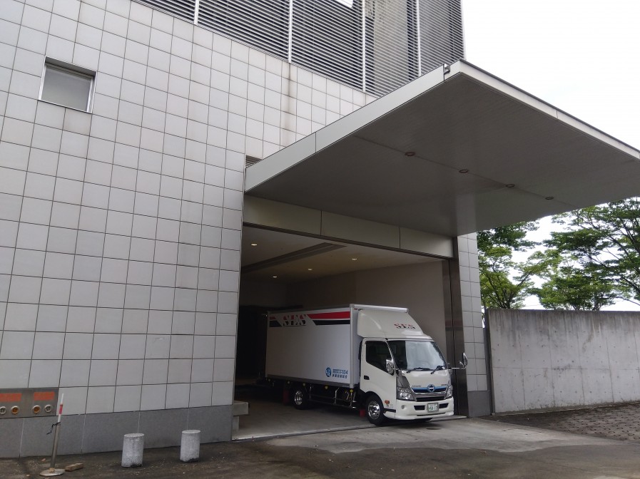 ここで名取市文化会館大ホール搬入口接車ポイントをご紹介したいと思います。まずは到着後搬入口のシャッターが開くまで待機(*´∀`)