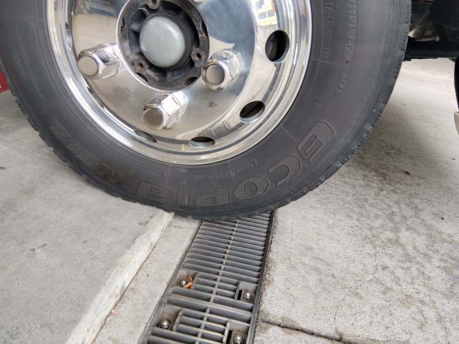 フロントタイヤが段差の上に乗った瞬間、この微妙な位置で止まる!段差にのせすぎたり、のせなかったりはNG😎こうする事で荷台パワーゲートの段差が最小限で決まる✨結果、より安全に積み下ろしが可能となります(ノ´∀`*)
